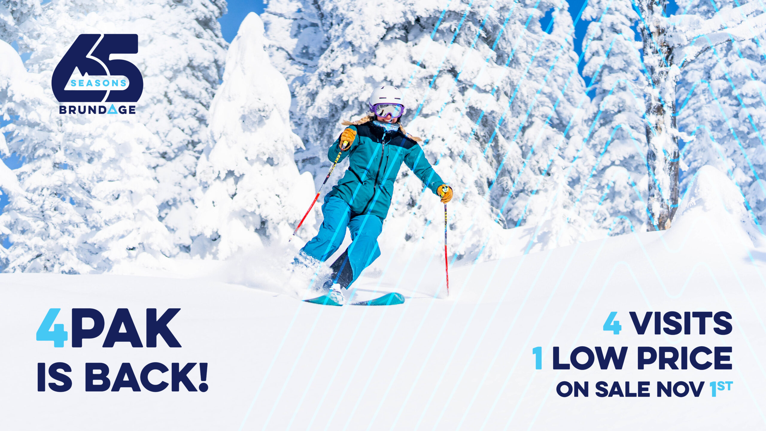 In celebration of 65 seasons at Brundage, this year’s 4PAK gives you 4 visits for just $260 – that’s only $65 a day.